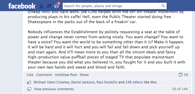 I just. Um. Okay. Really. Enough. Don’t blame your bad reviews on The Man. Please stop railing against straight white rich people who run the theater establishment and keep everybody else down. Stop being mad at TCG for being what it is and the convention for being uninspiring, etc. etc. It’s all much more complicated than that.